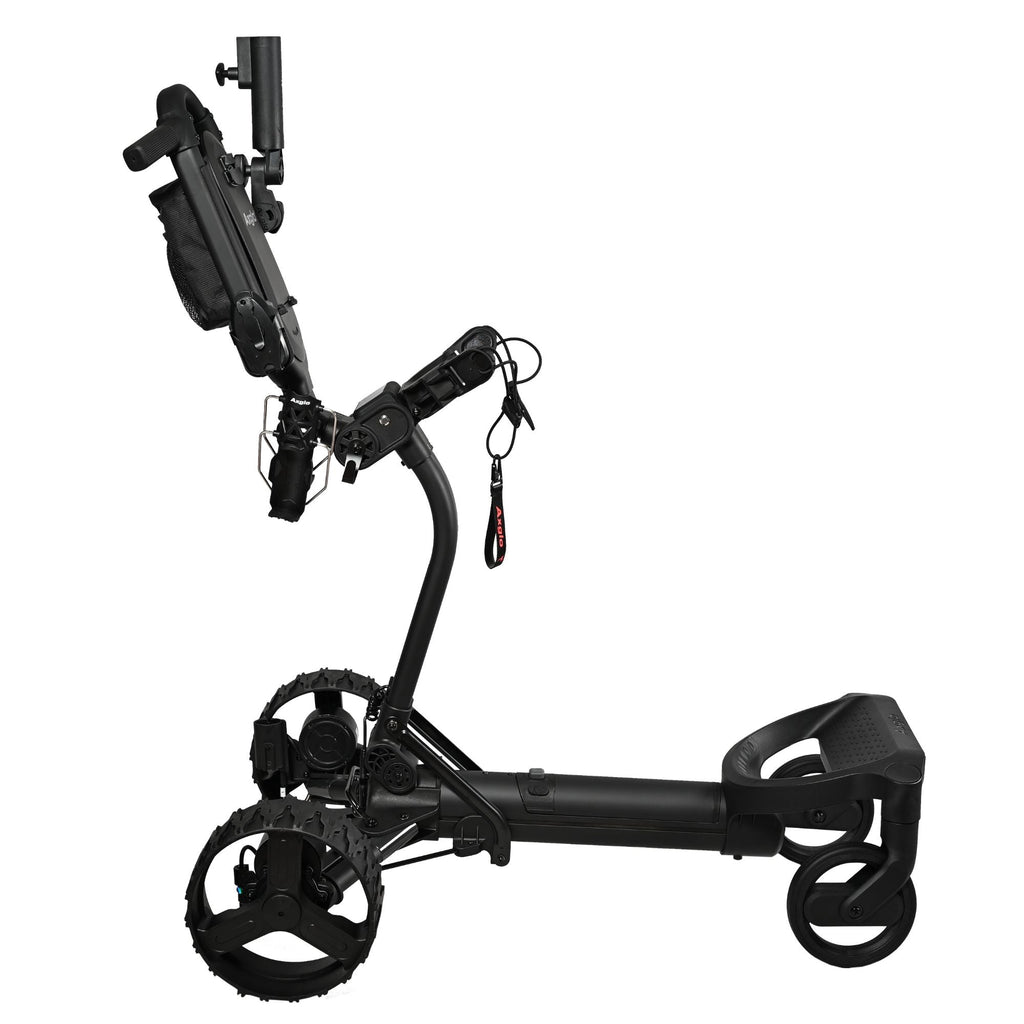 The Axglo E3 Remote Control Electric Golf Caddy looks like a regular manual push cart with lots of storage on the handle, compact design and easy 1 motion folding and unfolding for quick and easy setup. However, it comes with the ultra-lightweight lithium ion battery that can power the cart for up to 36 holes.