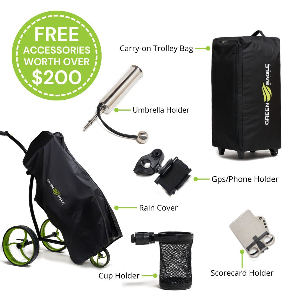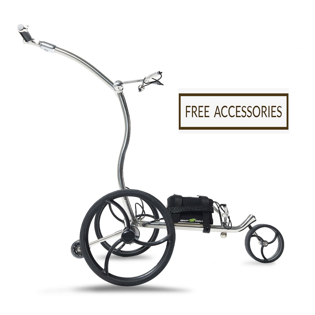 $200 OFF FOR THE CHRISTMAS SALE (ENDS 1/5)!! For a limited time, we are offering the Brand New Green Eagle Golf Terra Lithium, Remote Control Golf Trolley, for $749.00, normally $949.00 w/ 24V, 10Ah Li Ion Battery (up to 18-36 Holes per Charge/1000-1500 Charges) with FREE SHIPPING (Savings of $60.00) to all U.S. customers (excluding AK and HI - we currently do not ship to AK and HI). Includes the Remote, Battery and Charger. SPECIAL PROMOTION: For orders placed on or before 1/5, we will also include the complete accessory set: Drink Holder, Umbrella Holder, Scorecard Holder, Phone Holder, Carry Bag + Rain Cover - (Over $200.00 Value - ABSOLUTELY FREE!!).
