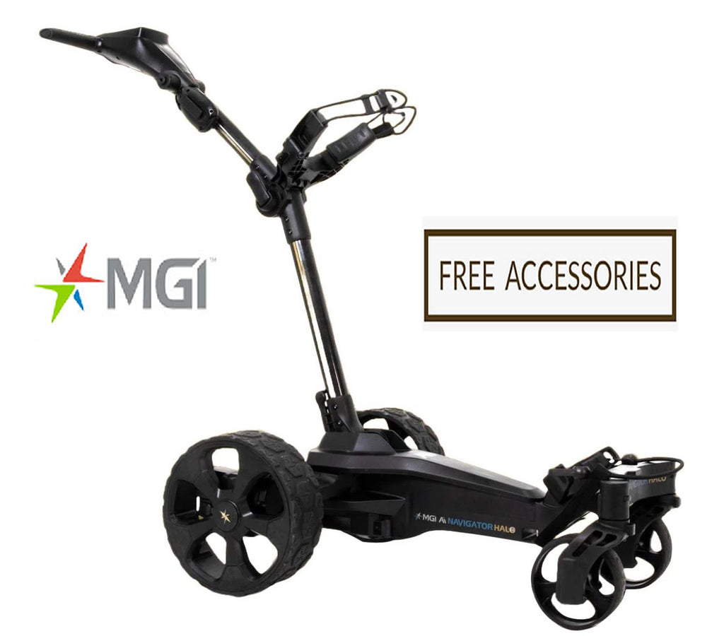 PRESIDENT'S DAY SALE (ENDS 2/16)!! For a limited time, we are offering the Brand New MGI Ai Navigator Halo Lithium Remote Control Golf Caddy for $2,599.00 (Geo-Fencing / No Follow) or MGI Ai Navigator Halo w/ Halo Eye (Follow / Geo Protect / Obstacle Avoidance / Point to Point Mode (Click-Drag to specific Spot) / Go Home Mode) with Extended 24V 36 Hole Lithium Battery for $2,999.00 with FREE SHIPPING to all U.S. customers (excluding AK and HI - we currently do not ship to AK and HI). Includes the Remote, Battery & Charger. SPECIAL PROMOTION: For orders placed on or before 2/16, we will also include FREE ACCESSORIES PACKAGE (OVER $100 VALUE!!) - (Current selection is limited based on availability): FREE ACCESSORY PACKAGE INCLUDES (Drink Holder, Umbrella Holder & GPS/SmartPhone Holder). If you are interested in the Regular MGI Ai GPS+ - click here! MGI Remote Control Caddy without the GPS check out the Zip Navigator AT - click here! If you are interested in the lighter MGI Quad Navigator (without GPS) - click here!