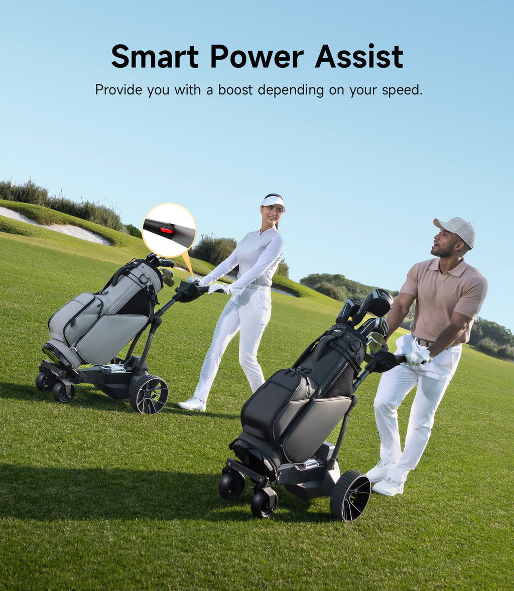 - All-Terrain Dominance + Downhill Control + Power Assist: All-terrain big wheels + motorized Power Assist tackle inclines, while automatic descent control ensures safety. Redefine electric golf push cart capability. Conquer 25° hills effortlessly! Motorized electric push golf cart propulsion tackles steep terrain, while patented Slope Master tech prevents tipping on slopes. True all-terrian stability with 10" knobby wheels.