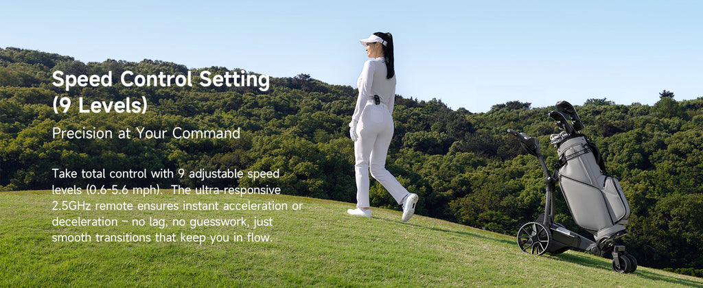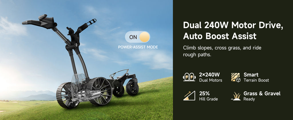 - All-Terrain Dominance + Downhill Control + Power Assist: All-terrain big wheels + motorized Power Assist tackle inclines, while automatic descent control ensures safety. Redefine electric golf push cart capability. Conquer 25° hills effortlessly! Motorized electric push golf cart propulsion tackles steep terrain, while patented Slope Master tech prevents tipping on slopes. True all-terrian stability with 10" knobby wheels.